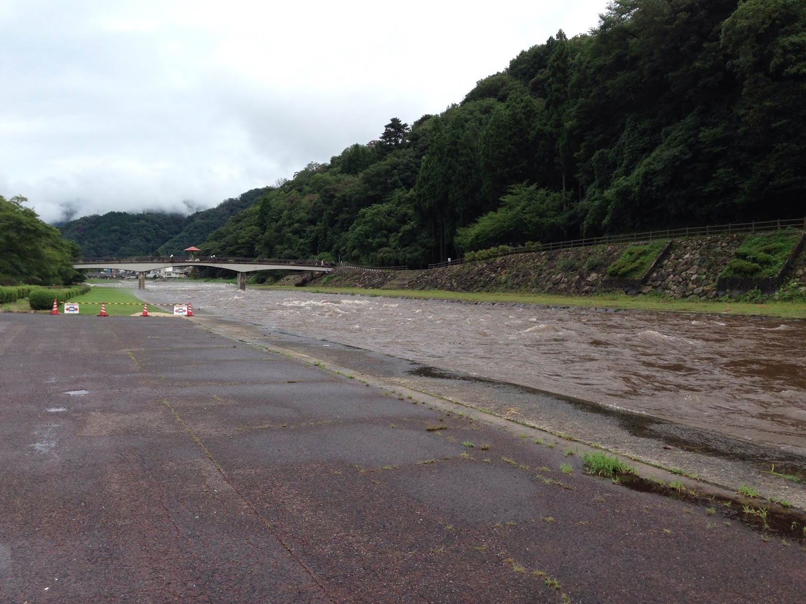 | 三朝の温泉街の駐車場。地面と水位が一緒に。 |